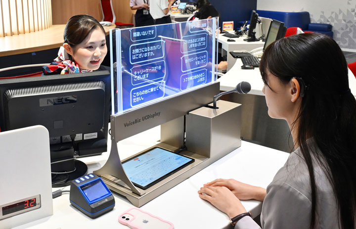 羽田空港で実施されたVoiceBiz UCDisplayの実証実験で聴覚障がいを持つ利用者役の社員(右)と字幕でやり取りするJALのグランドスタッフ=24年7月2日 PHOTO: Tadayuki YOSHIKAWA/Aviation Wire