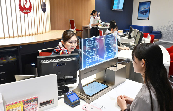 羽田空港で実施されたVoiceBiz UCDisplayの実証実験で聴覚障がいを持つ利用者役の社員(右)と字幕でやり取りするJALのグランドスタッフ=24年7月2日 PHOTO: Tadayuki YOSHIKAWA/Aviation Wire