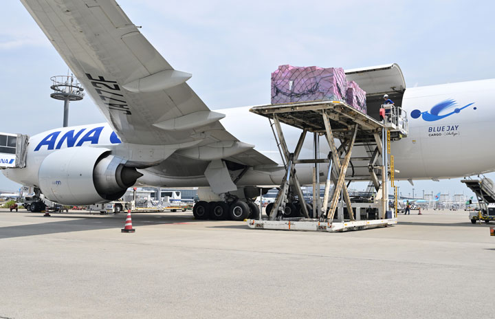 成田空港で貨物室に貨物を積み込むANAの777F貨物機=24年7月8日 PHOTO: Tadayuki YOSHIKAWA/Aviation Wire