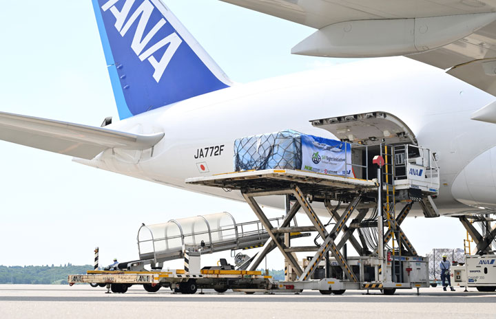 成田空港でANAの777F貨物機によるシカゴ行きNH8402便に積み込まれる京セラの貨物=24年7月8日 PHOTO: Tadayuki YOSHIKAWA/Aviation Wire