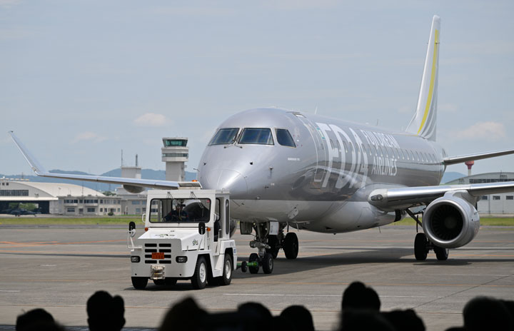 県営名古屋空港の格納庫へトーイングされるFDAの10号機=24年7月18日 PHOTO: Tadayuki YOSHIKAWA/Aviation Wire