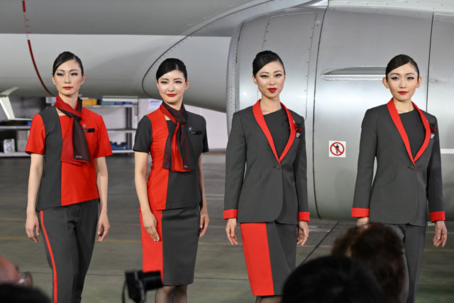 県営名古屋空港の格納庫で開かれた発表会で新制服を披露するFDAの客室乗務員たち=24年7月18日 PHOTO: Tadayuki YOSHIKAWA/Aviation Wire