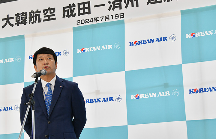 成田発済州行き再開を記念しあいさつする大韓航空日本地域の李本部長=24年7月19日 PHOTO: Yusuke KOHASE/Aviation Wire