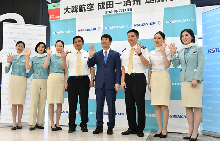 済州-成田線往復の再開初便の乗務員と記念写真に収まる大韓航空日本地域の李本部長(右から4人目)=24年7月19日 PHOTO: Yusuke KOHASE/Aviation Wire