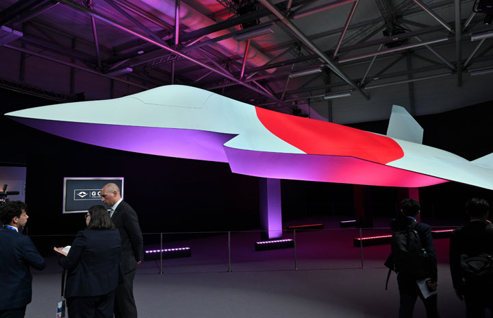 ファンボロー航空ショーでお披露目され日章旗が投影されたGCAPの新モックアップ=24年7月22日 PHOTO: Tadayuki YOSHIKAWA/Aviation Wire