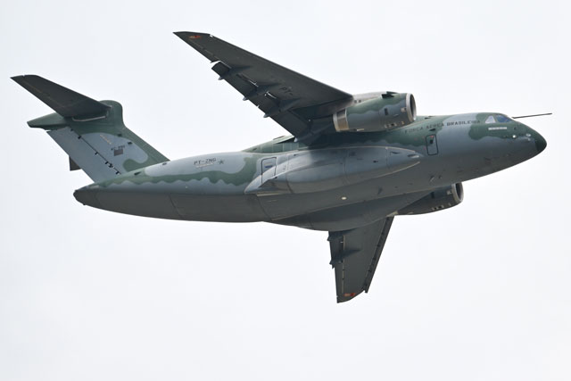 ファンボロー航空ショーで展示飛行するエンブラエルのKC-390=24年7月23日 PHOTO: Tadayuki YOSHIKAWA/Aviation Wire