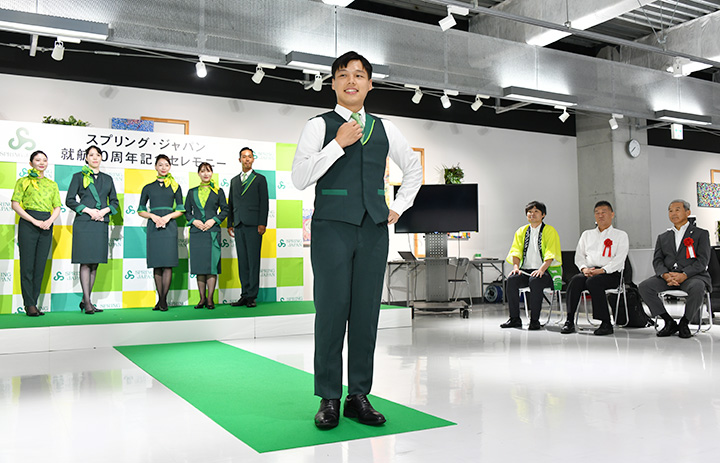 新制服をお披露目するスプリング・ジャパンの客室乗務員=24年8月1日 PHOTO: Yusuke KOHASE/Aviation Wire