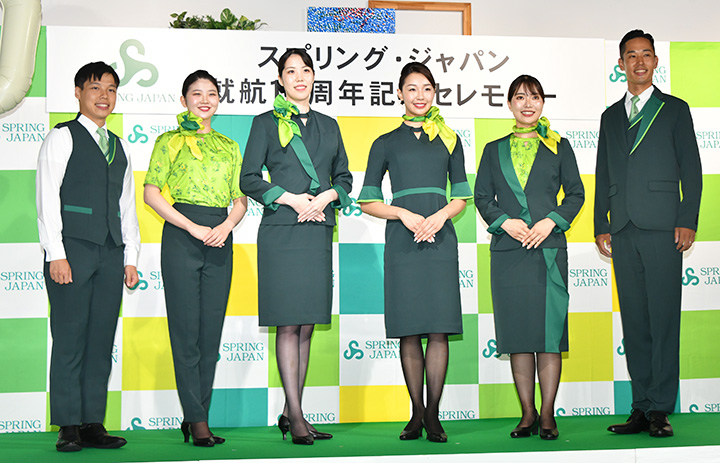 新制服をお披露目するスプリング・ジャパンの客室乗務員=24年8月1日 PHOTO: Yusuke KOHASE/Aviation Wire