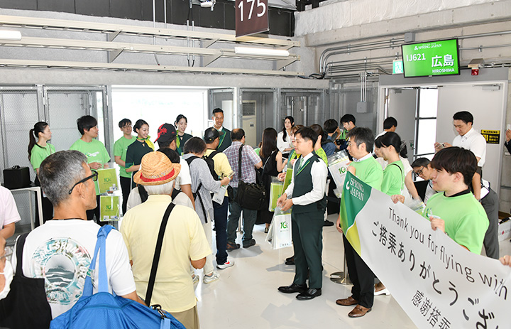 スプリング・ジャパンの就航10周年記念品を手にし搭乗する成田発広島行きIJ621便の利用客=24年8月1日 PHOTO: Yusuke KOHASE/Aviation Wire