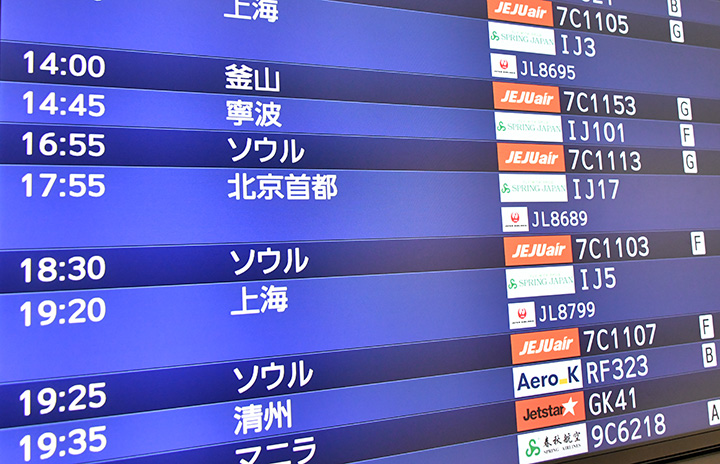 スプリング・ジャパンのIJ17便北京行きを示す成田空港の出発案内モニター=24年8月1日 PHOTO: Yusuke KOHASE/Aviation Wire
