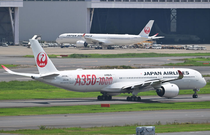 羽田空港を出発するJAL A350-1000 2号機(手前)と到着したばかりの4号機=24年8月1日 PHOTO: Tadayuki YOSHIKAWA/Aviation Wire