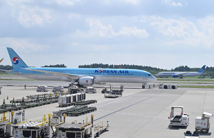 成田空港を出発する大韓航空787-10初号機によるソウル行きKE704便とユナイテッド航空の787-9=24年8月2日 PHOTO: Tadayuki YOSHIKAWA/Aviation Wire