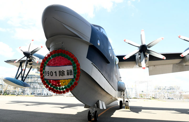 新明和工業甲南工場で開かれたUS-2 9901号機の除籍セレモニー(海自阪神基地隊のXから)