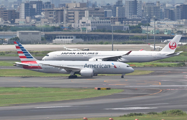 羽田B滑走路に着陸するJALのA350-1000 5号機(奥)と羽田を出発するアメリカン航空の787-8=24年8月11日 PHOTO: Tadayuki YOSHIKAWA/Aviation Wire