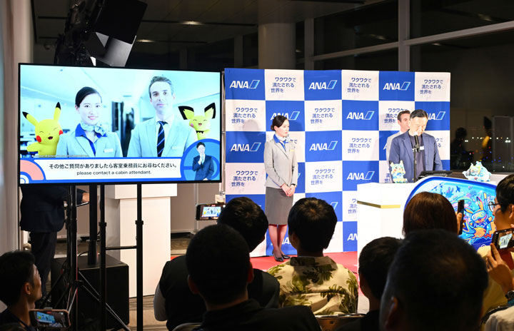 羽田空港でお披露目された「ANA x ポケモン 機内安全ビデオ」=24年8月15日 PHOTO: Tadayuki YOSHIKAWA/Aviation Wire