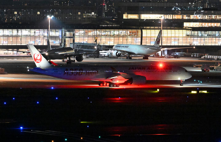 羽田空港を出発するJALのA350-1000初号機によるニューヨーク行きJL4便(手前)と18日の運航を終えた777-300ER JA736J(奥左)、シドニー行きJL51便のJA734J=24年8月18日 PHOTO: Tadayuki YOSHIKAWA/Aviation Wire