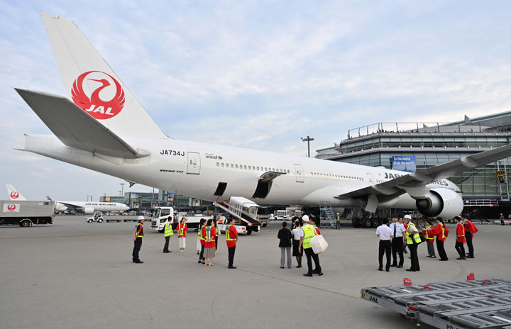 羽田空港に到着したJAL初の777-300ER退役機となるJA734Jを見学する社員ら=24年8月19日 PHOTO: Tadayuki YOSHIKAWA/Aviation Wire
