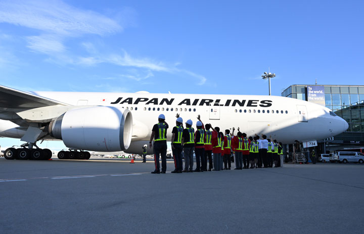羽田空港に到着したJAL初の777-300ER退役機となったJA734Jによるシドニー発JL52便を出迎えた社員ら=24年8月20日 PHOTO: Tadayuki YOSHIKAWA/Aviation Wire