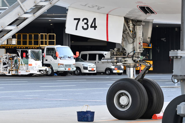 羽田空港に到着したJAL初の777-300ER退役機となるJA734Jの前脚=24年8月20日 PHOTO: Tadayuki YOSHIKAWA/Aviation Wire