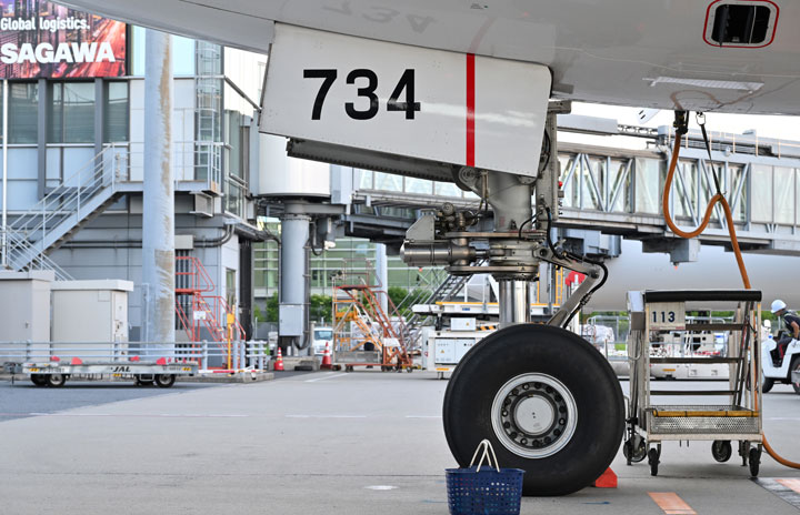 羽田空港に到着したJAL初の777-300ER退役機となったJA734Jの前脚=24年8月20日 PHOTO: Tadayuki YOSHIKAWA/Aviation Wire