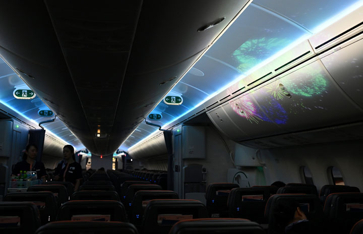 AirJapanの成田発シンガポール行きNQ3便の機内に投影された花火の映像=24年8月23日 PHOTO: Tadayuki YOSHIKAWA/Aviation Wire