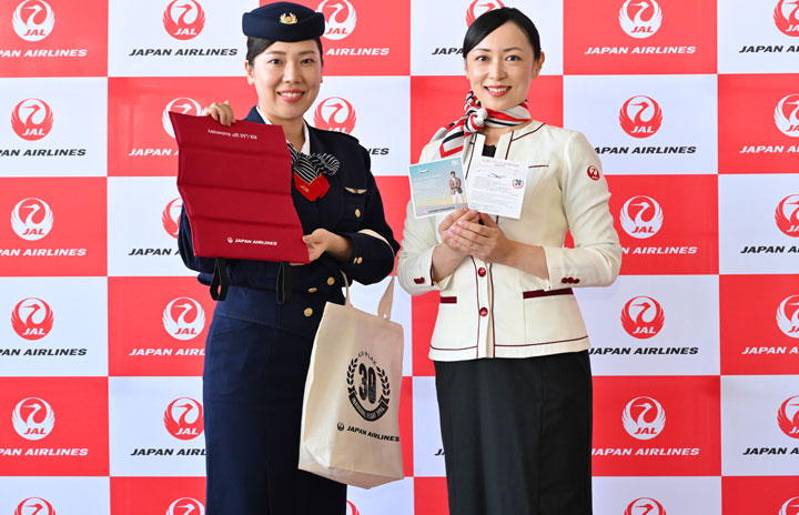 関空の30番搭乗口でJAL関西-ロサンゼルス線30周年の記念品や大谷選手の搭乗記念証を手にする7代目制服(左)と現行11代目制服を着用した客室乗務員=24年9月4日 PHOTO: Tadayuki YOSHIKAWA/Aviation Wire