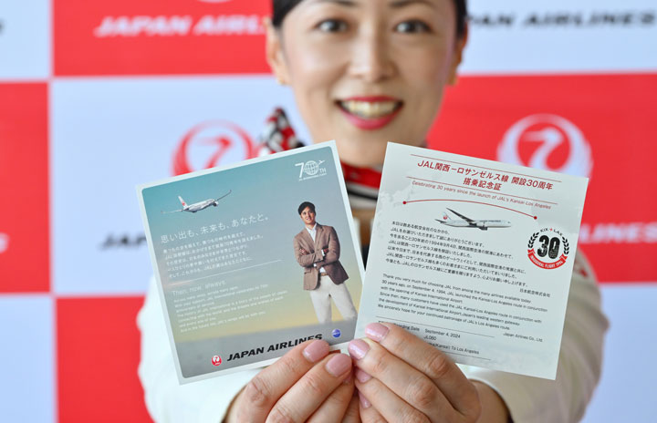 関空の30番搭乗口でJAL関西-ロサンゼルス線30周年を記念した大谷選手の搭乗記念証を手にする客室乗務員=24年9月4日 PHOTO: Tadayuki YOSHIKAWA/Aviation Wire