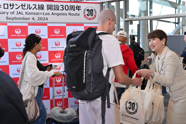 関空の30番搭乗口でJAL関西-ロサンゼルス線30周年の記念品を乗客に手渡すJALの宮坂常務=24年9月4日 PHOTO: Tadayuki YOSHIKAWA/Aviation Wire