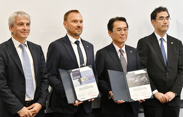 水素航空機開発への超電導モーター技術共同研究で協定を締結したエアバスのオムバッハ氏(左から2人目)と東芝ESSの竹内氏(右から2人目)=24年10月16日 PHOTO: Yusuke KOHASE/Aviation Wire