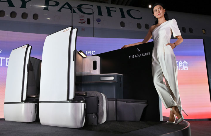 キャセイパシフィック航空の新ビジネスクラス「アリア・スイート」を紹介する香港のハリウッド女優ファラ・チャンさん =24年10月16日 PHOTO: Tadayuki YOSHIKAWA/Aviation Wire