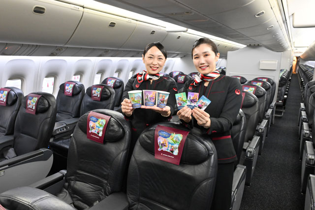 ディズニーの特別塗装機「JAL Fantastic Journey Express」の機内で紙コップとステッカーを手にするJALの客室乗務員=24年10月21日 PHOTO: Tadayuki YOSHIKAWA/Aviation Wire