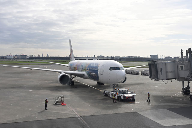初便の福岡行きJL323便の運航に向けて羽田空港の11番スポットにトーイングされるJALのディズニー特別塗装機「JAL Fantastic Journey Express」=24年10月21日 PHOTO: Tadayuki YOSHIKAWA/Aviation Wire
