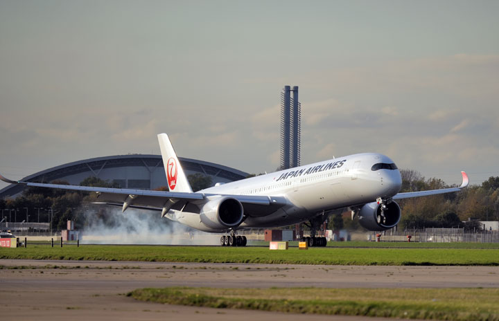 ロンドン・ヒースロー空港に着陸するJALのA350-1000初便羽田発JL43便(同社提供)