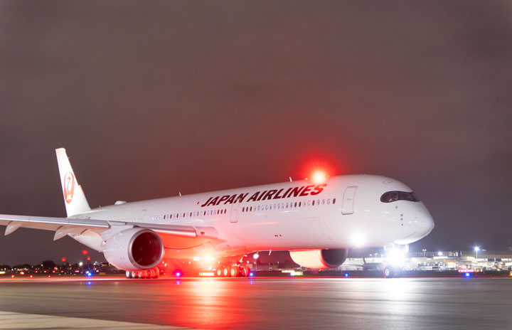 ヒースロー空港を出発するJALのA350-1000ロンドン発初便羽田行きJL44便(同社提供)