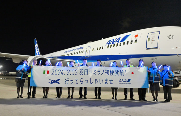 羽田空港で出発を待つANAのミラノ行き初便NH207便の前で横断幕を掲げる平澤専務ら=24年12月3日 PHOTO: Tadayuki YOSHIKAWA/Aviation Wire