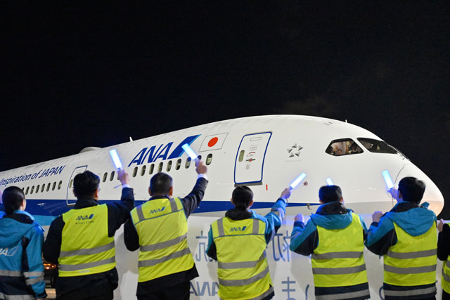 コックピットから手を振るANAの羽田発ミラノ行き初便NH207便のパイロット=24年12月3日 PHOTO: Tadayuki YOSHIKAWA/Aviation Wire