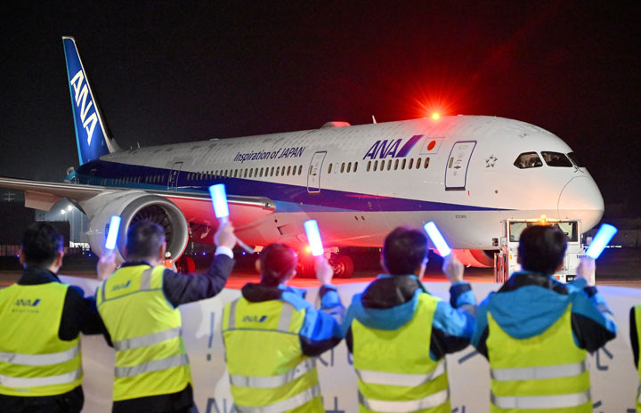 ANAの社員らに見送られて羽田空港を出発するミラノ行き初便NH207便=24年12月3日 PHOTO: Tadayuki YOSHIKAWA/Aviation Wire