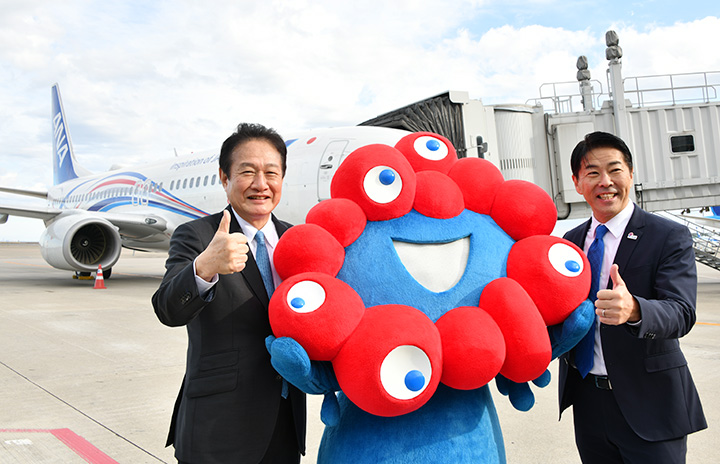 「EXPO2025 ANA JET」をミャクミャクとアピールするANAの井上社長(左)とANAウイングスの江島聖志社長=24年12月12日 PHOTO: Yusuke KOHASE/Aviation Wire