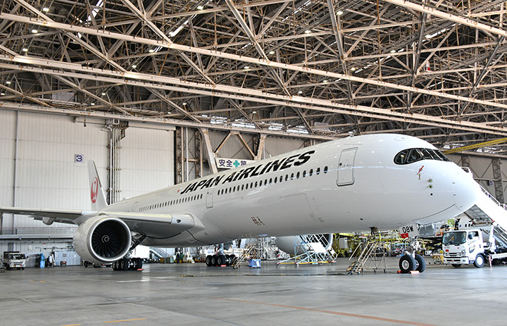羽田空港の格納庫に入り就航前整備作業が進むJALのA350-1000 8号機JA08WJ=24年12月16日 PHOTO: Yusuke KOHASE/Aviation Wire