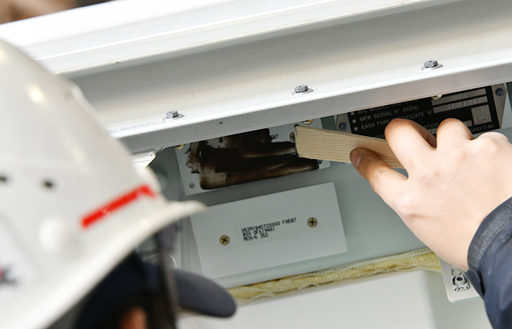 A350-1000 8号機JA08WJの識別板取り付け前のL1ドア上部に接着剤を塗るJALの整備士=24年12月16日 PHOTO: Yusuke KOHASE/Aviation Wire