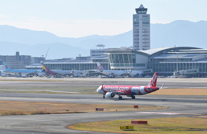 福岡空港から離陸するタイ・エアアジアのA321neoと国際線ターミナル横に建てられた新管制塔=24年12月23日 PHOTO: Tadayuki YOSHIKAWA/Aviation Wire