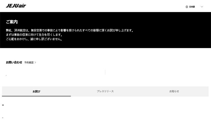 務安事故に対するお詫びを載せたチェジュ航空のウェブサイト