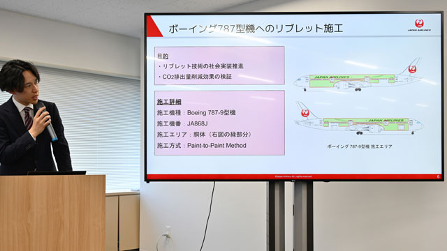 787のリブレット塗装を説明するJALエンジニアリングの緒方隆裕氏=25年1月10日 PHOTO: Tadayuki YOSHIKAWA/Aviation Wire