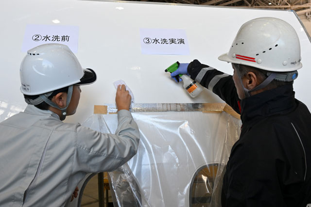 リブレットの塗装施工をモックアップで実演するオーウエルとJALECのスタッフ=25年1月10日 PHOTO: Tadayuki YOSHIKAWA/Aviation Wire