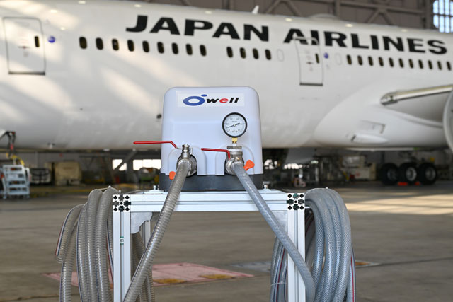 塗装によるリブレット施工で水洗に使うオーウエルの機器=25年1月10日 PHOTO: Tadayuki YOSHIKAWA/Aviation Wire