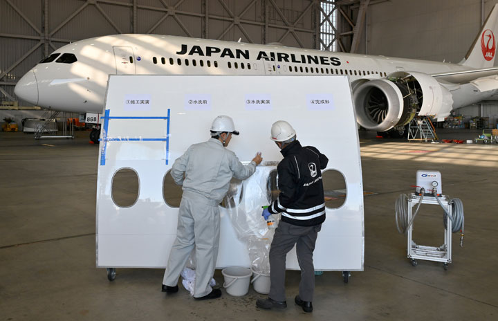 リブレット施工したJALの787-9の前でモックアップを使い塗装を実演するオーウエルとJALECのスタッフ=25年1月10日 PHOTO: Tadayuki YOSHIKAWA/Aviation Wire