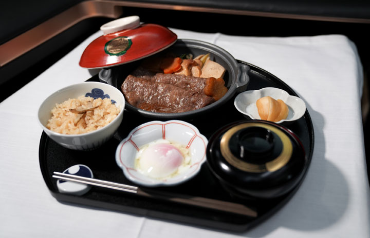 スターラックス航空の成田発ファーストクラス機内食「人形町今半黒毛和牛ロースすき焼」(同社提供)