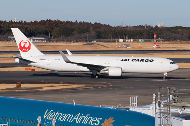 成田空港に到着するJALの767-300BCF 3号機JA621J=25年1月17日 PHOTO: Youichi KOKUBO/Aviation Wire