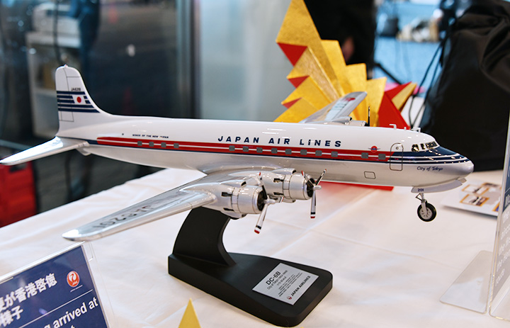 JALが70年前の香港線開設当初に投入したDC-6Bの模型=25年2月4日 PHOTO: Yusuke KOHASE/Aviation Wire