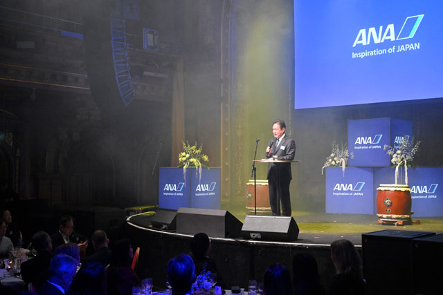 ストックホルムで開かれたガラパーティーであいさつするANAの井上慎一社長=25年2月4日 PHOTO: Tadayuki YOSHIKAWA/Aviation Wire